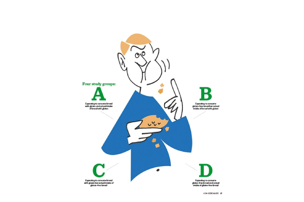Many people now exclude gluten from their diet, despite not having coeliac disease or a wheat allergy, because they experience symptoms such as bloating, diarrhoea, constipation, headaches and fatigue. However, there is a lack of knowledge about the underlying mechanisms. “Not enough is known about the negative health effects in people who experience gluten or wheat sensitivity. Wheat, especially wholegrain wheat, is an important dietary component because wholegrains are so beneficial for health,” says Daisy Jonkers. In the nocebo study, the research team studied people’s negative expectations of gluten and how this affects perceived symptoms. The nocebo effect is the opposite of the placebo effect, which means that negative expectations exacerbate or even create symptoms. The study was a randomised double-blind study in which 83 people, aged 18 to 70, with selfperceived negative problems with gluten intake, participated. They were first tested to rule out coeliac disease, wheat allergy or other gastrointestinal disease and then randomly assigned to one of four study groups: